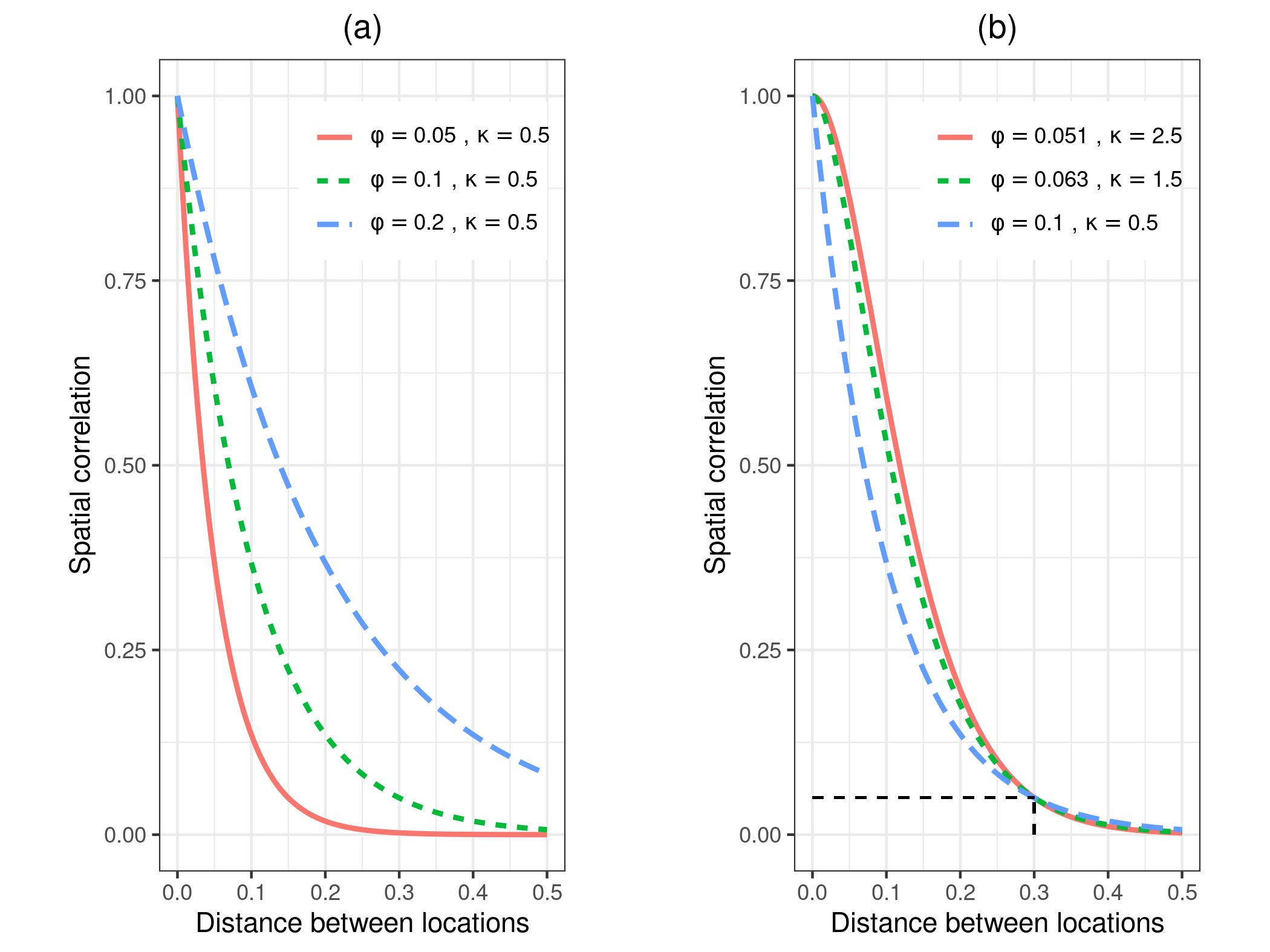 where \(\phi>0\) and \(\kappa>0\) are parameters and \(K_\kappa(\cdot)\) is the modified Bessel function of the third kind of order \(\kappa\). The parameters \(\phi\) and \(\kappa\) regulate how fast the spatial correlation decays to zero with increasing distance, and the smoothness of the process, respectively. By smoothness we mean the degree of differentiability of the underlying spatial surface: smaller values of \(\kappa\) produce rougher, less regular surfaces, whereas larger values of \(\kappa\) lead to smoother and more spatially continuous processes.