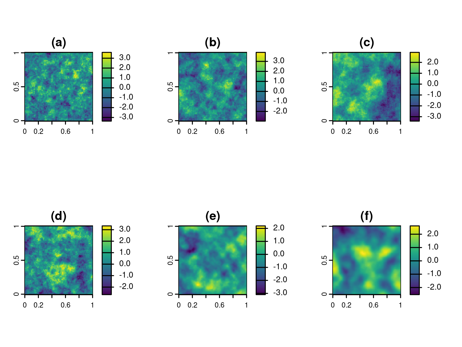 In Figure 1.7, we show three realizations from these correlation functions. We notice that smaller values of \(\kappa\) (e.g., \(\kappa = 0.5\)) produce rougher and less regular spatial patterns, whereas larger values (e.g., \(\kappa = 2.5\)) result in smoother and more continuous surfaces. These visual differences reflect the varying degrees of differentiability of the Gaussian process, which mathematically determines its local behavior and hence its smoothness.