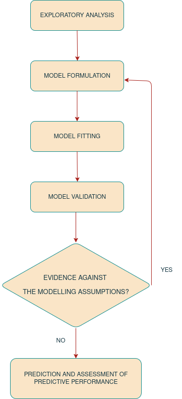 Once estimation has been carried out, the next step is model validation, where diagnostic tools are used to assess whether the fitted model can be trusted to represent the observed variation in the outcome. If the diagnostics indicate a poor fit, the process returns to the formulation stage to address the shortcomings revealed by the validation. If no evidence against the model is found, we move on to spatial prediction.