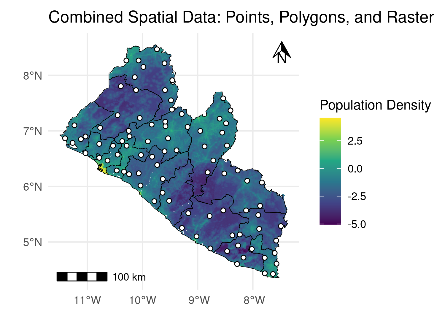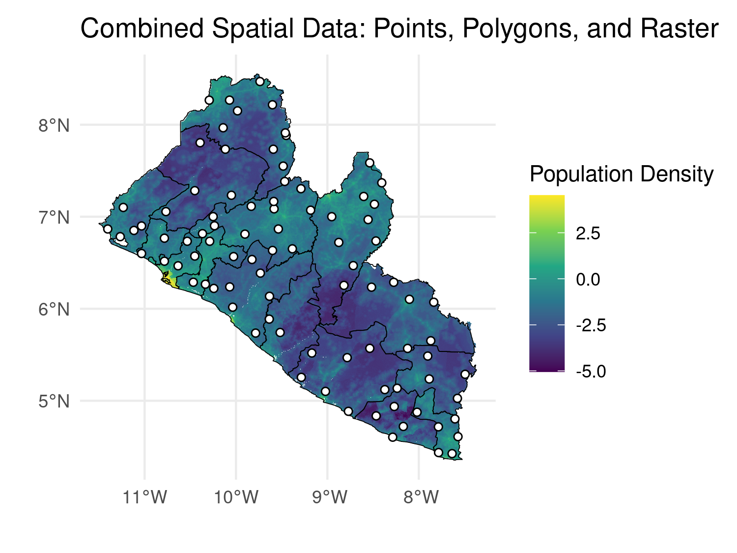 labs(title = "Combined Spatial Data: Points, Polygons, and Raster",