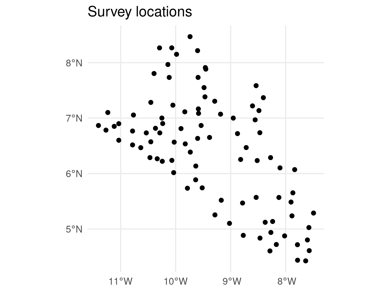 Here geom_sf() is used to plot the spatial points. aes(color = prevalence) specifies that the points should be colored based on the prevalence covariate, providing a visual representation of spatial variation in disease risk. The scale_color_viridis_c() function applies the Viridis color scale, which is well-suited for continuous data and is friendly for those with color blindness. The labels = scales::label_percent() argument ensures that the color scale’s labels are displayed as percentages (e.g., 5, 10%) rather than raw decimal values. To make the plot visually clean and minimal, theme_minimal() is applied, stripping away unnecessary background elements and keeping the focus on the data. Finally, the labs() defines the plot title and the color legend label.