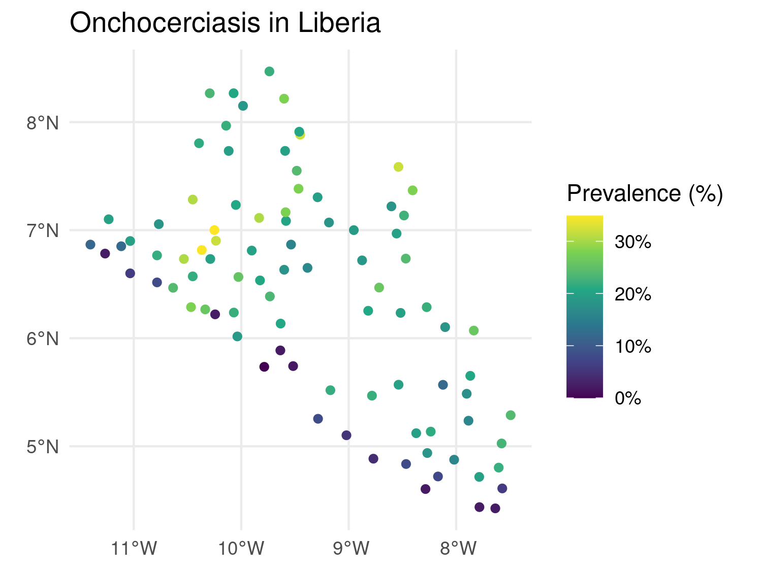 Point data often represents the locations of observations (e.g., disease cases, sampling sites). ggplot2 allows you to plot these points and optionally color them by a covariate (e.g., disease prevalence or population density). Here is an example that uses the Liberia data.