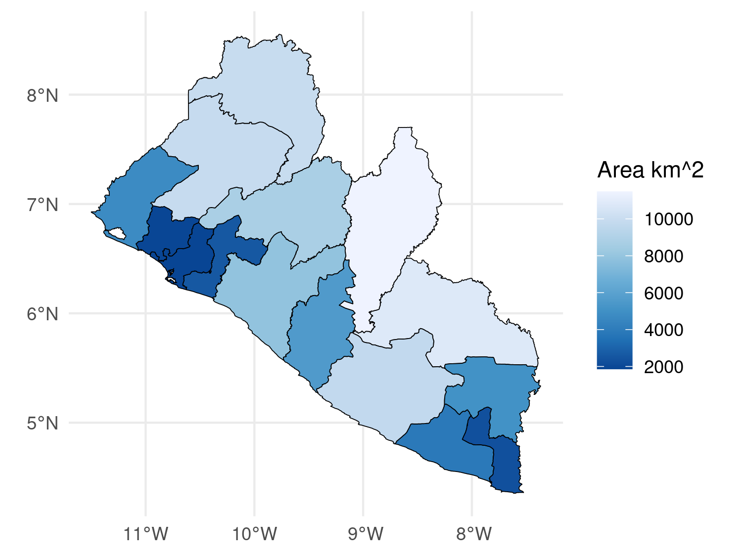 liberia_admin1$area <- as.numeric(st_area(liberia_admin1) / 1000 ^ 2)