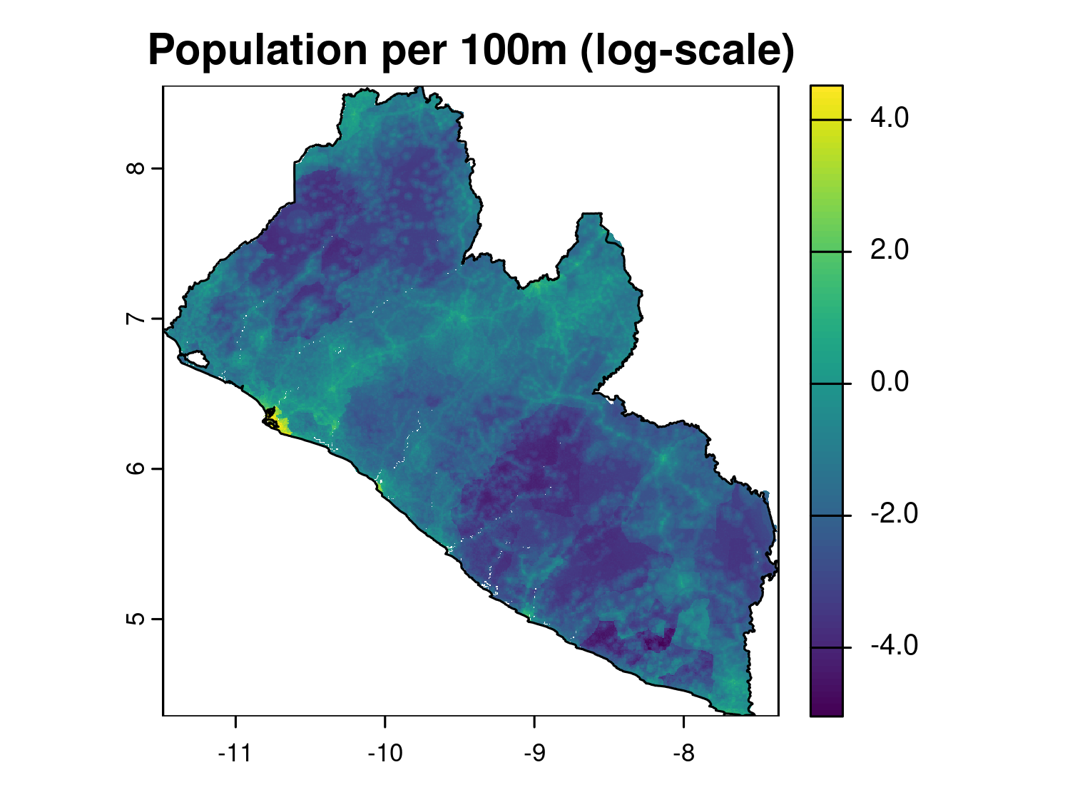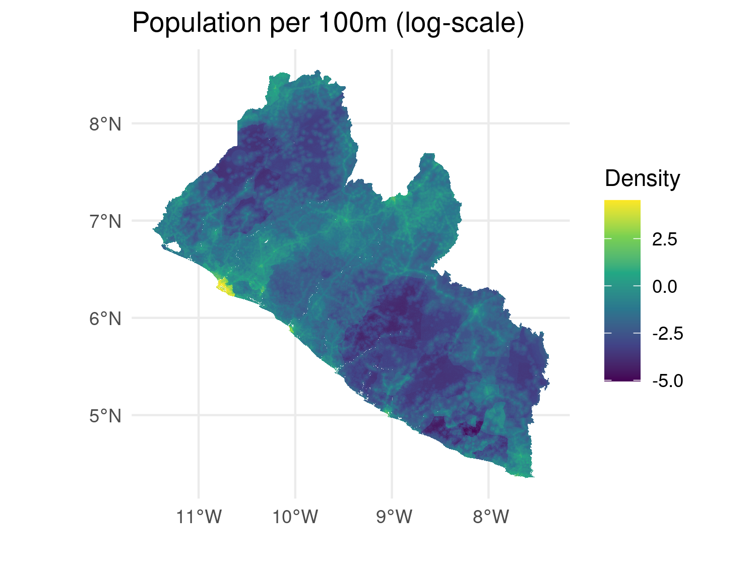 Population density is a key covariate in geostatistical models for public health research. In this section, we demonstrate how to retrieve high-resolution population data for Liberia from WorldPop using the wpgpDownloadR package. This package provides easy access to the WorldPop datasets, which offers gridded population estimates at various spatial resolutions.
