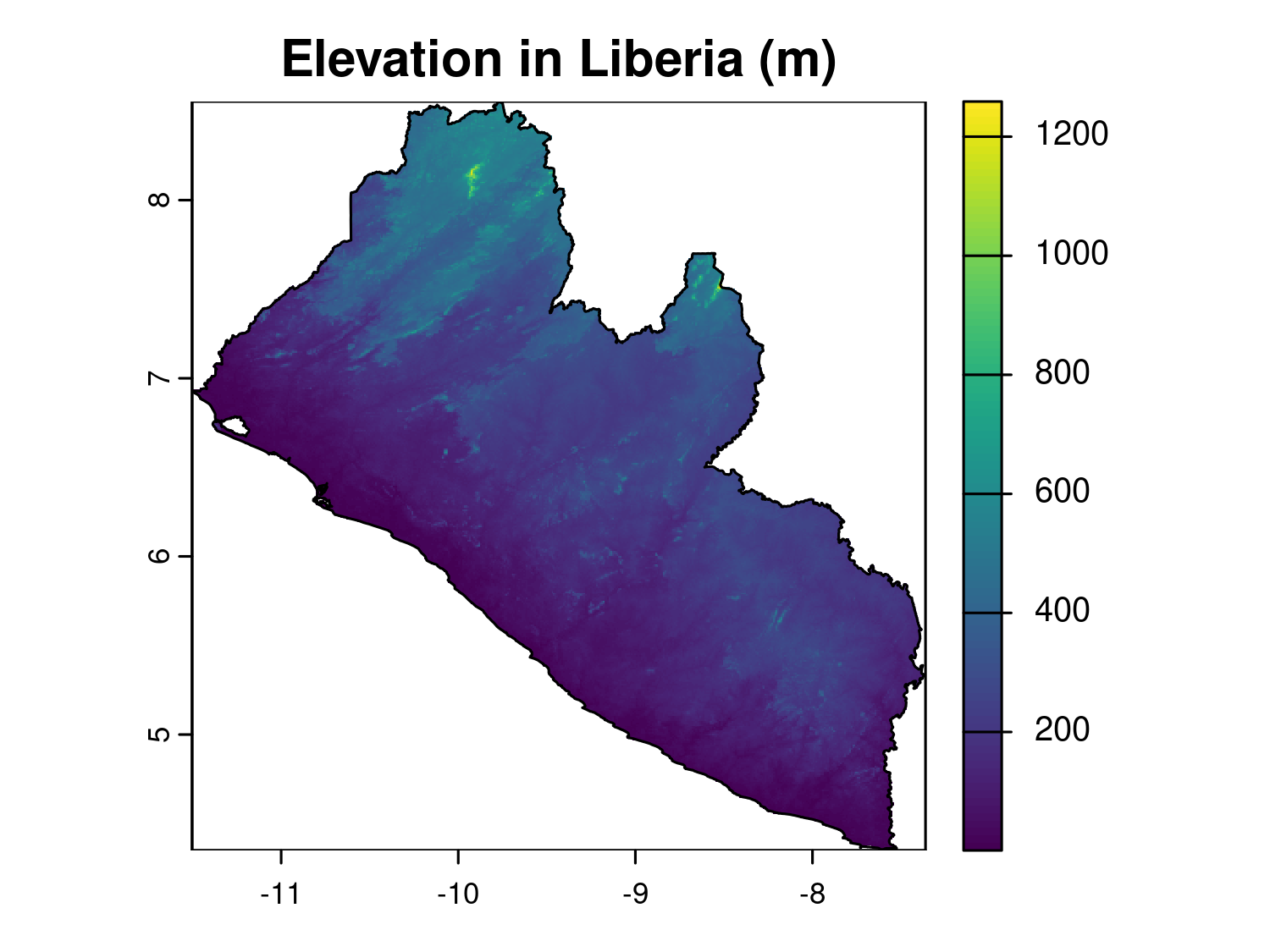 terra::plot(elev_rast, main = "Elevation in Liberia (m)")