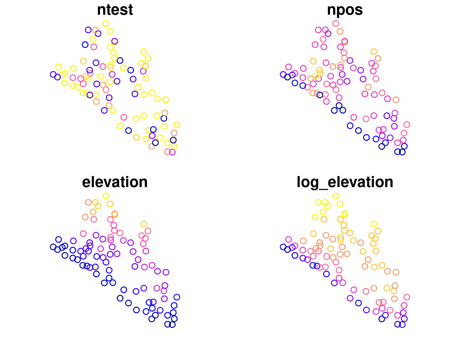 Visualizing Spatial Data: Visualization is crucial for exploring spatial data, interpreting model results, and communicating findings. Whether working with point-referenced data, polygons, or rasters, clear and effective visualization helps reveal patterns that inform the modeling process. Effective visualization can also help highlight covariate trends, spatial clusters, and uncertainty in predictions.