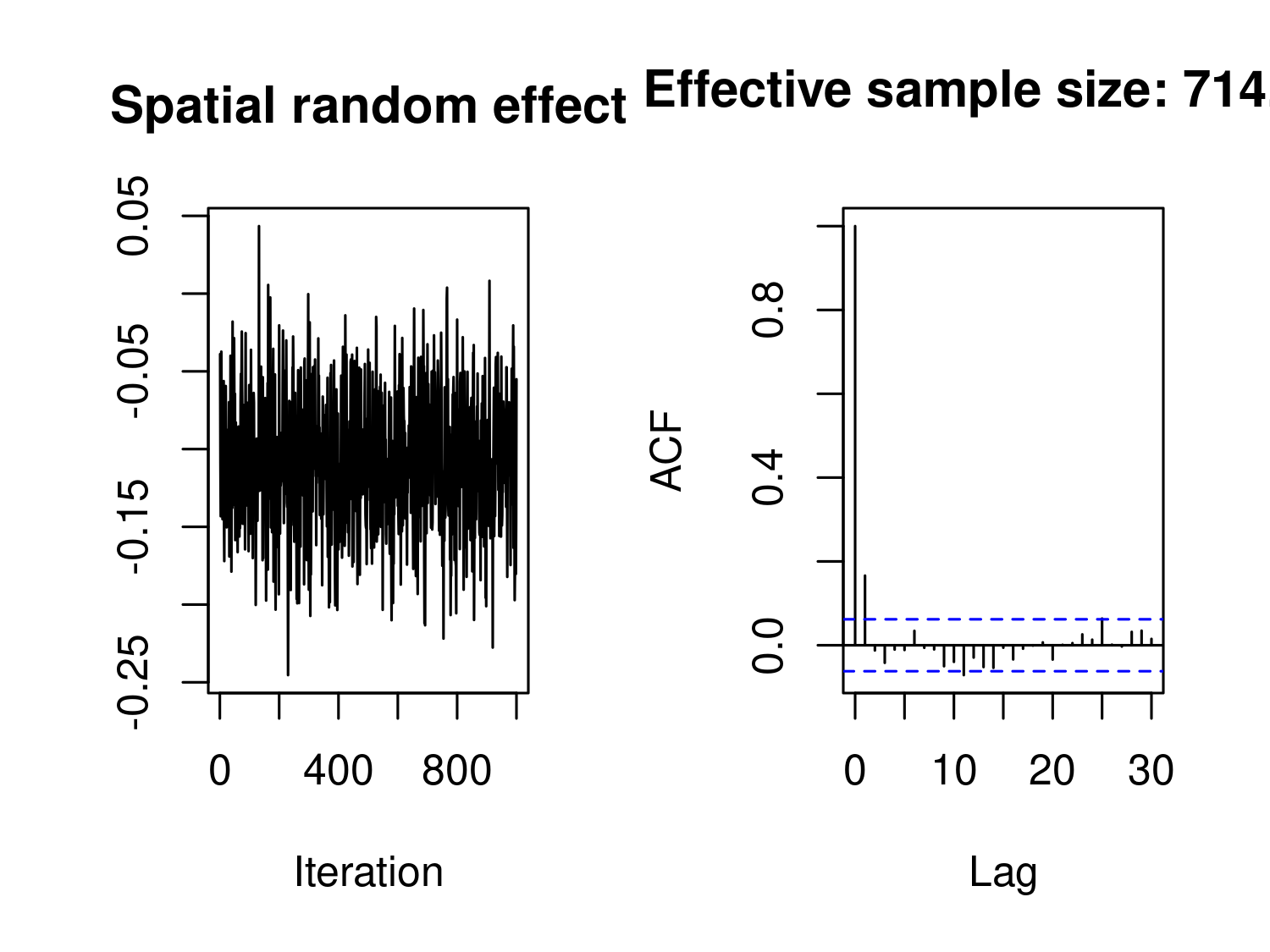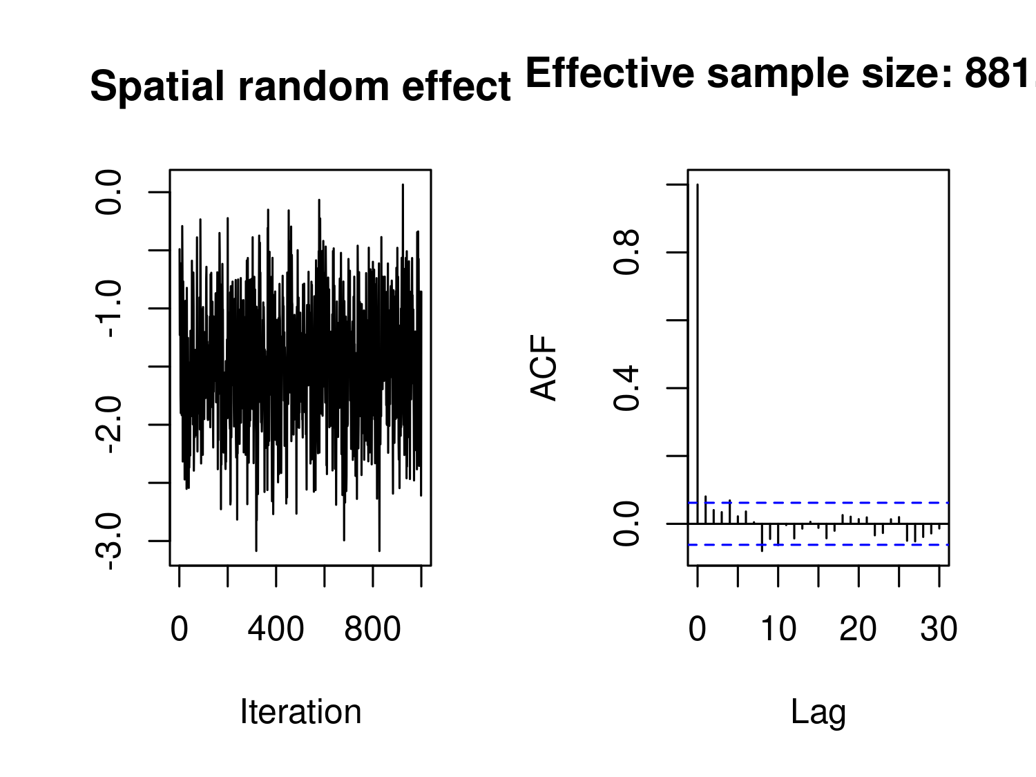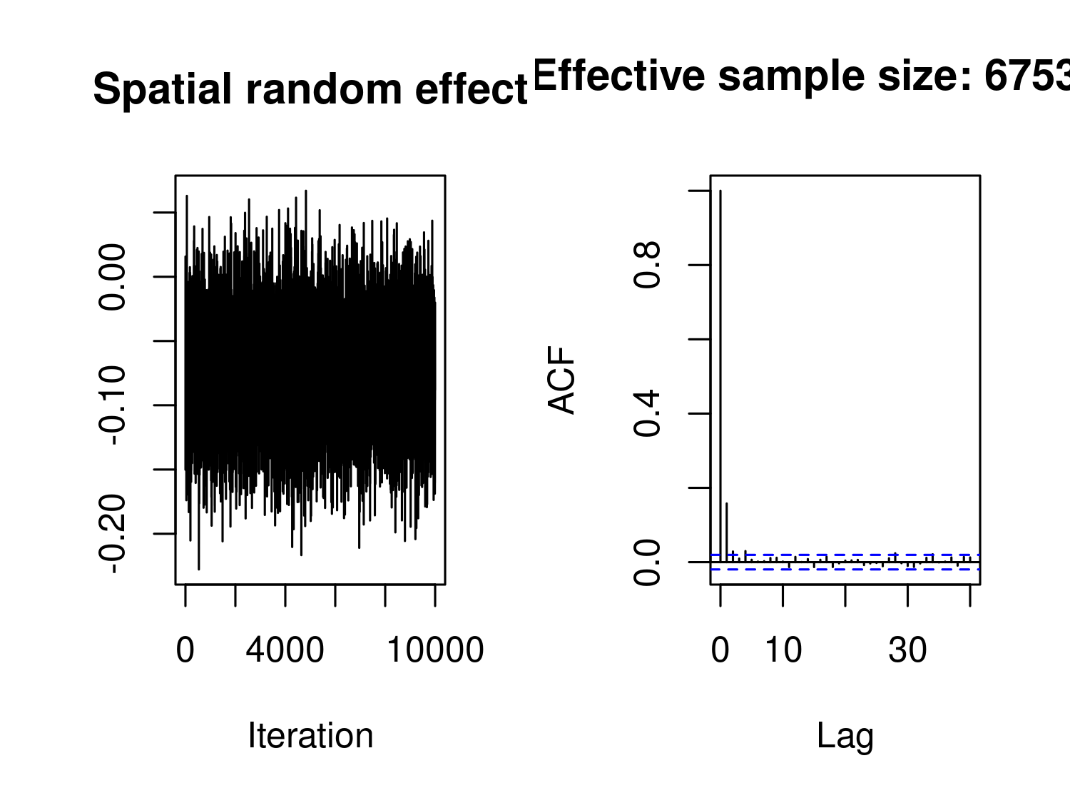 The code above performs an additional step in the MCML estimation, using 10,000 MCMC samples. As shown in Figure 3.14, these MCMC samples exhibit good mixing and low autocorrelation, which indicates that they adequately approximate the likelihood function of the Binomial geostatistical model. Although additional MCMC iterations could be run to obtain estimates closer to the true maximum likelihood estimate (since we are approximating the likelihood function and not obtaining the exact MLE), we choose not to do so here. This decision is due to both the computational time required and the minimal impact of Monte Carlo error on spatial predictions in this case.