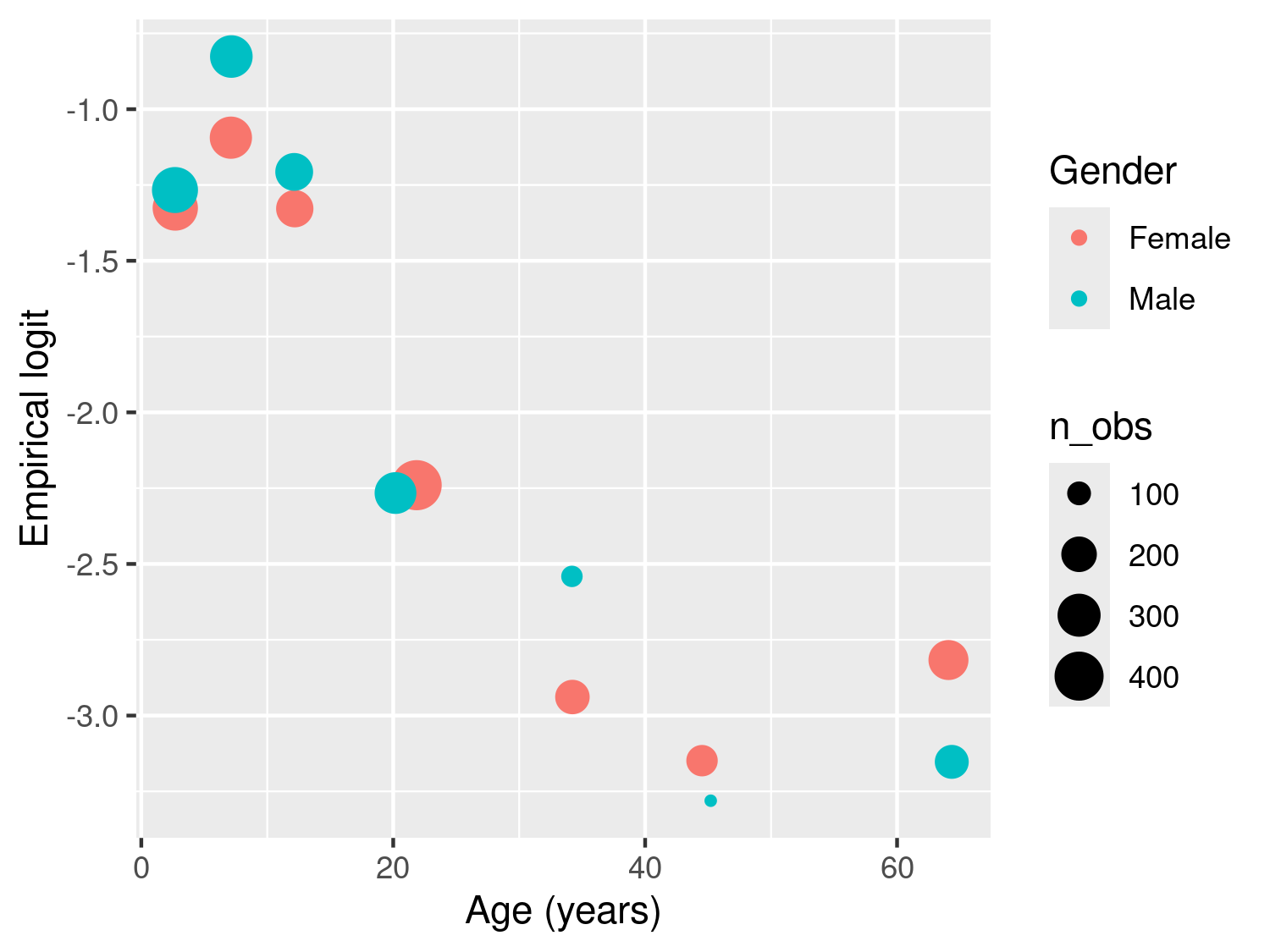 The resulting plot in Figure 3.4 shows the empirical logit against age by gender, with the size of each of the points proportional to the number of observations falling within each class. The observed patterns are explained by the fact that young children, especially those under the age of five, are particularly vulnerable to severe malaria infections. This is primarily due to their immature immune systems and lack of acquired immunity. As individuals grow older, they generally develop partial immunity to malaria through repeated exposure to the disease. This acquired immunity can provide some level of protection against severe malaria. At the same time, gender roles and activities can influence exposure to malaria-carrying mosquitoes. For example, men may spend more time outdoors for work or other activities, increasing their exposure to mosquito bites and thus their risk of infection. In addition, there are also biological factors to consider. Hormonal and genetic differences between males and females may also contribute to variations in immune responses to malaria infection. The interaction between age and gender is complex and may vary depending on the specific context and population being studied. A 2020 report from the Bill & Melinda Gates foundation provides a detailed overview of this and other aspects related to gender and malaria (Katz and Bill & Melinda Gates Foundation 2020).