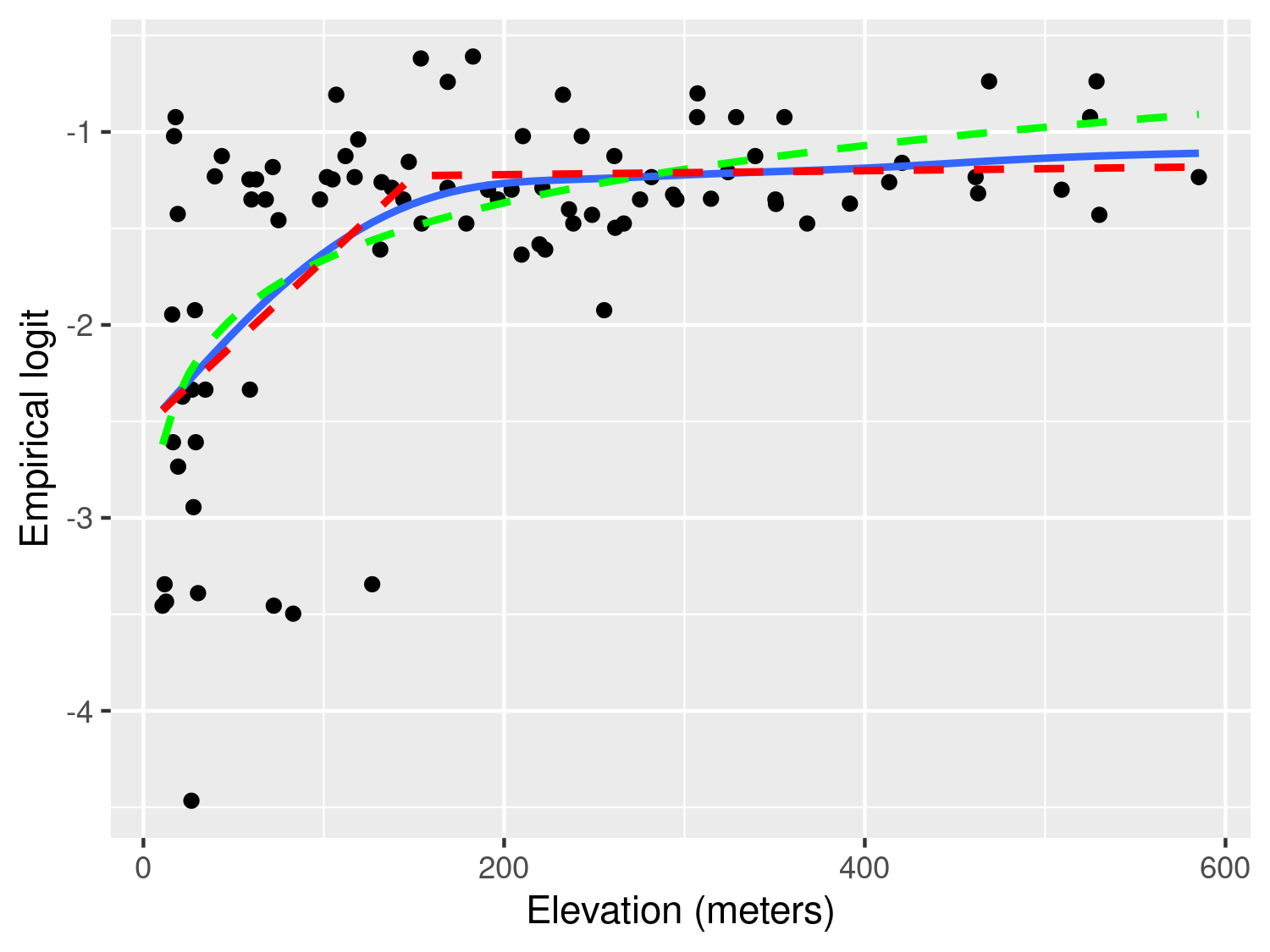 Figure 3.2 shows the scatter plot of the empirical logit against elevation. In this plot, we have also added three lines though the stat_smooth from the ggplot2 package. Using this function, we first pass the term gam to method to add a penalized smoothing spline (Hastie, Tibshirani, and Friedman 2001), represented by the blue solid line. The smoothing spline allows us to better discern the type of relationship and how to best capture it using a standard regression approach. As we can see from Figure 3.2, the smoothing spline corroborates our initial observation of a positive relationship up to about 150 meters, followed by a plateau.