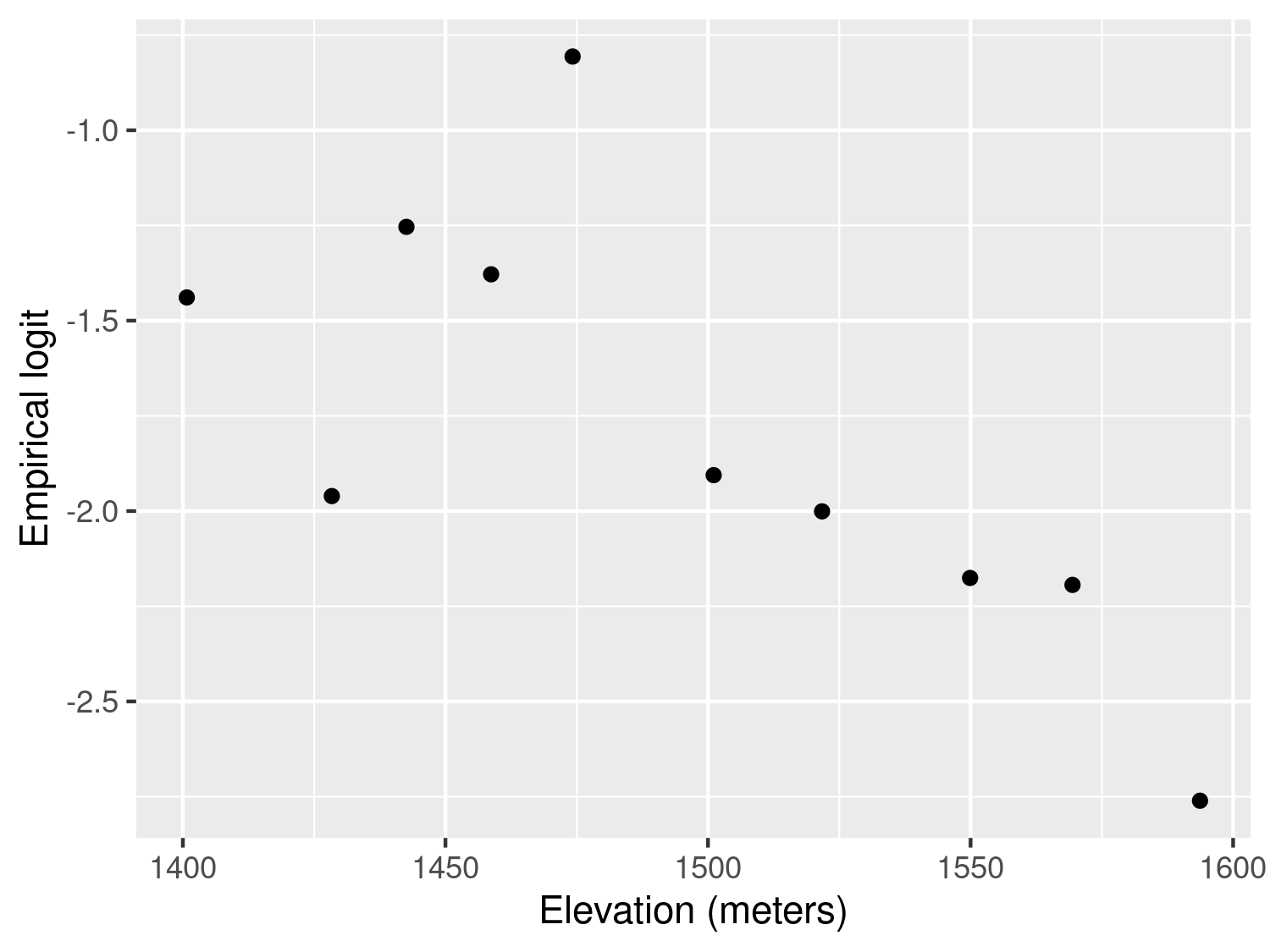 labs(x="Elevation (meters)",y="Empirical logit") +
