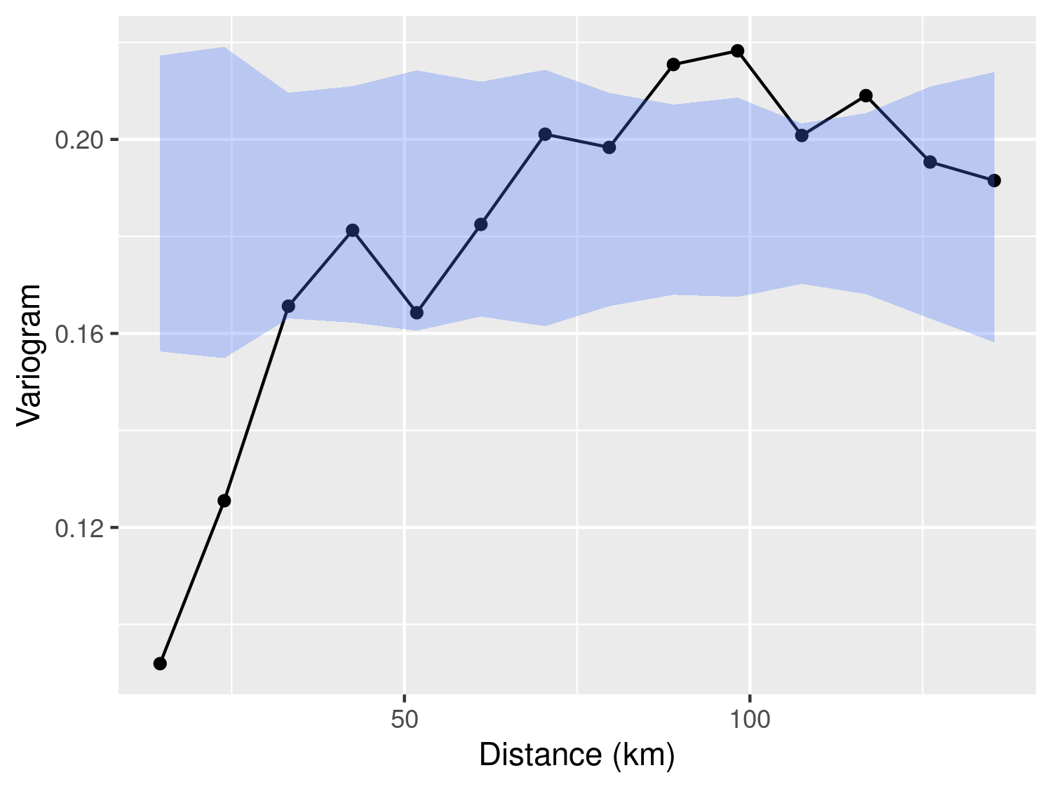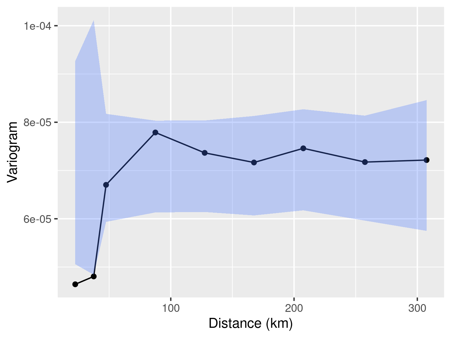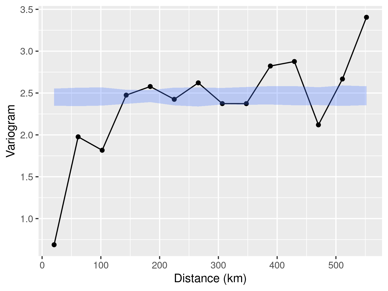 \] Making use of the R code presented in Section 3.1.3.1, use the function s_variogram to generate the empirical variogram for this model and compare this to the empirical variogram of Figure 3.7. What differences do you observe?