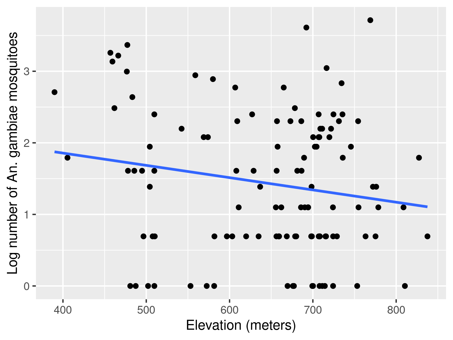 labs(x="Elevation (meters)",y="Log number of An. gambiae mosquitoes") +