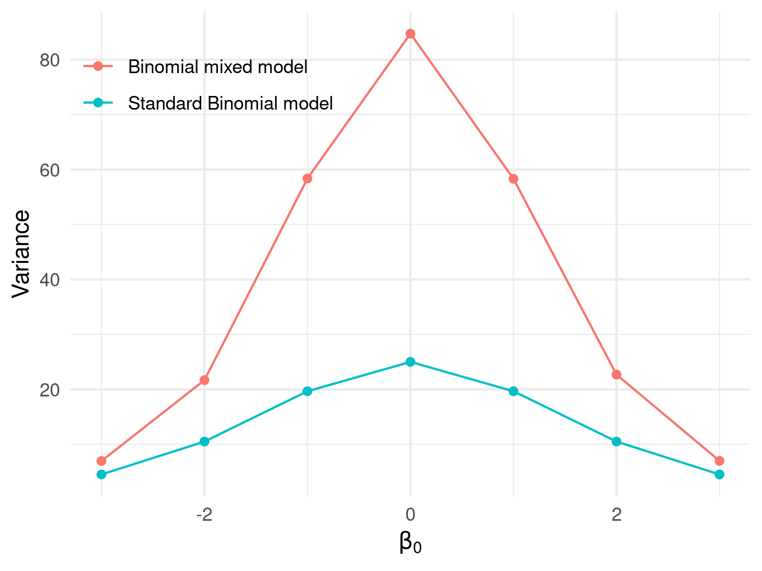 Consider the Binomial mixed model with linear predictor as defined in Equation 3.7. By editing the code for the simulation shown in Section 3.1.2, generate a graph as in Figure 3.6 under the two following scenarios: \(i\)) \(\tau^2 = 0.2\) and \(n_i=100\); \(ii\)) \(\tau^2 = 0.1\) and \(n_i = 1\). How does the variance of \(Y_i\) change under \(i\)) and \(ii\)) in comparison to Figure 3.6? How do you explain the differences?
